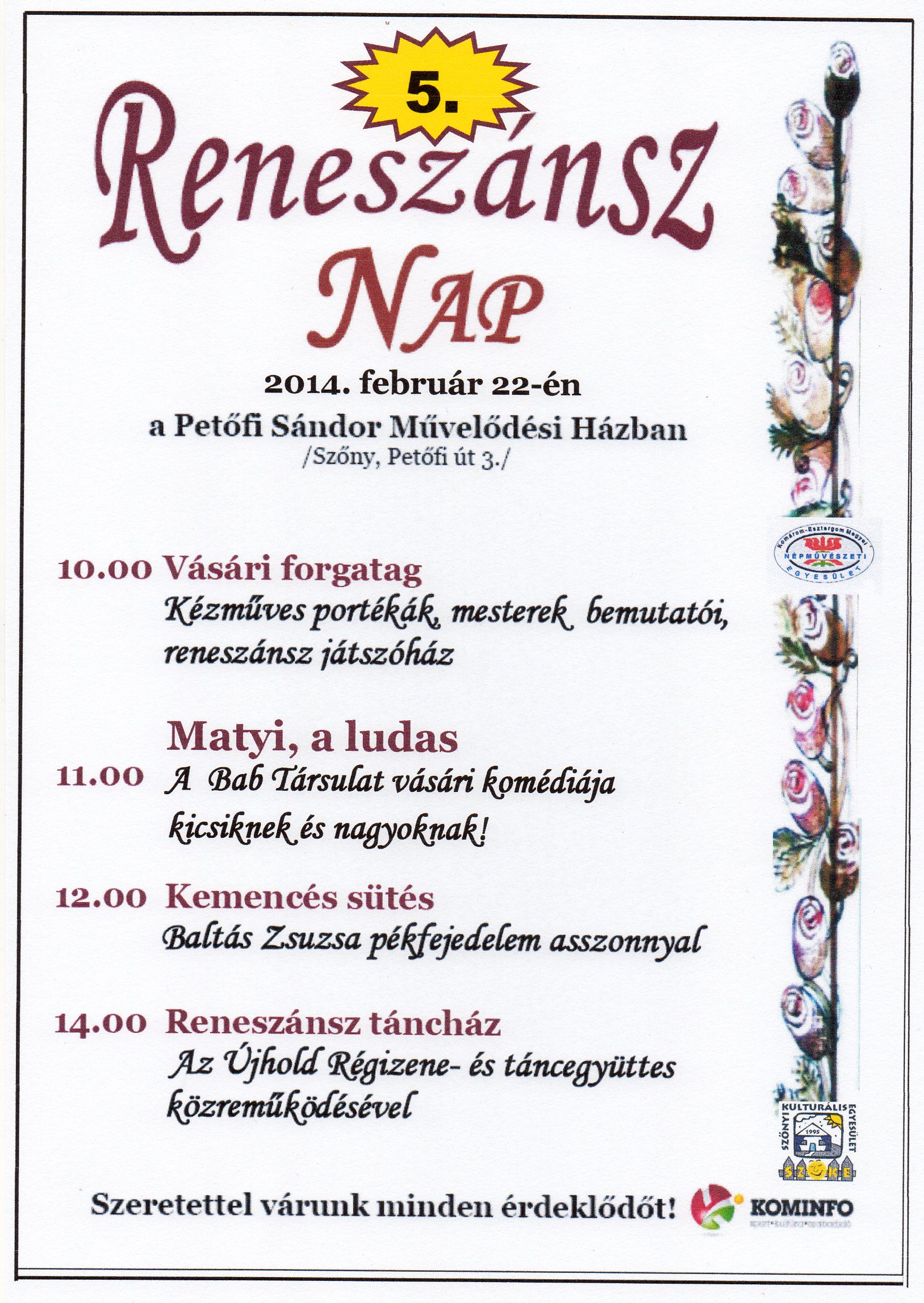 Már hagyományosnak mondható a szőnyi Petőfi Sándor Művelődési Házban 5. alkalommal megrendezésre kerülő Reneszánsz Nap. Februárban a farsangi bálok idején, azokhoz hasonlatos vidám hangulatú egész napos családi program. A reneszánsz, újjászületés jó beharangozója a tavasznak, illeszkedik a vidám farsangi időszakhoz és sok érdeklődőket vonz, ezért rendezzük meg minden év februárjában.