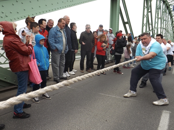 Szintén ezen a napon két fontos sporteseményre is sor került. Elsőként a déli és az északi erős emberek húzták a kötelet az Erzsébet hídon. Az első jó néhány évben mi bizonyultunk erősebbnek, de az elmúlt két esztendőben az északiak remekeltek. Ezúttal ismét nekik állt a zászló. Ezen a versenyen azonban mindenképpen Komáromé a dicsőség.